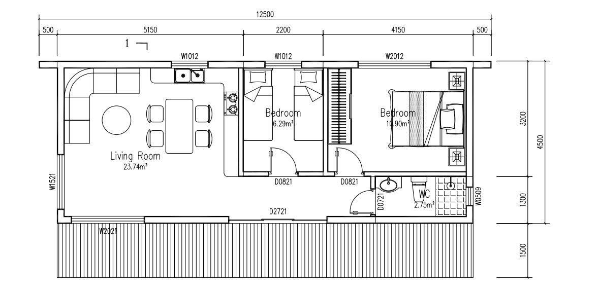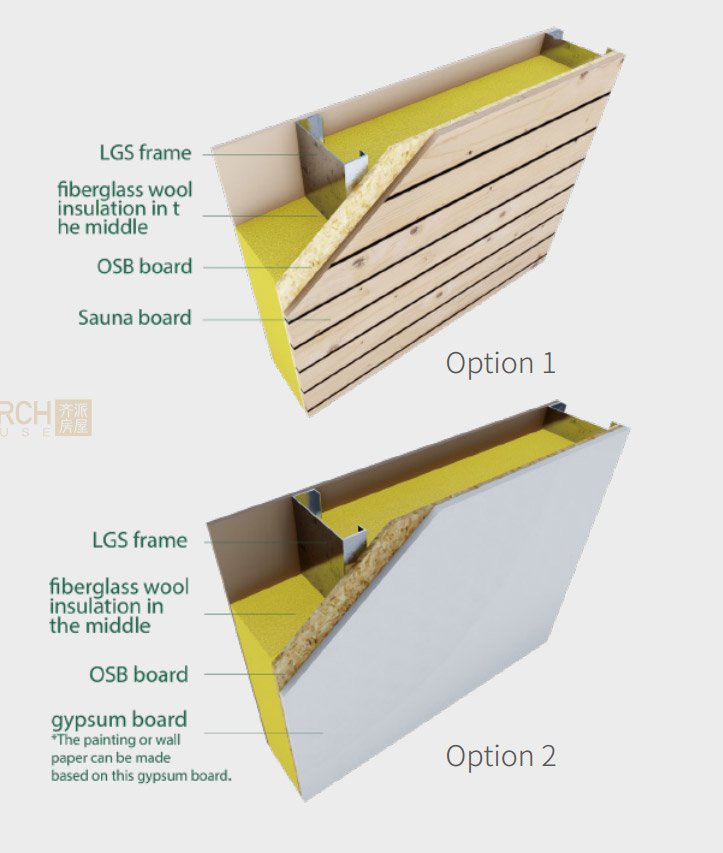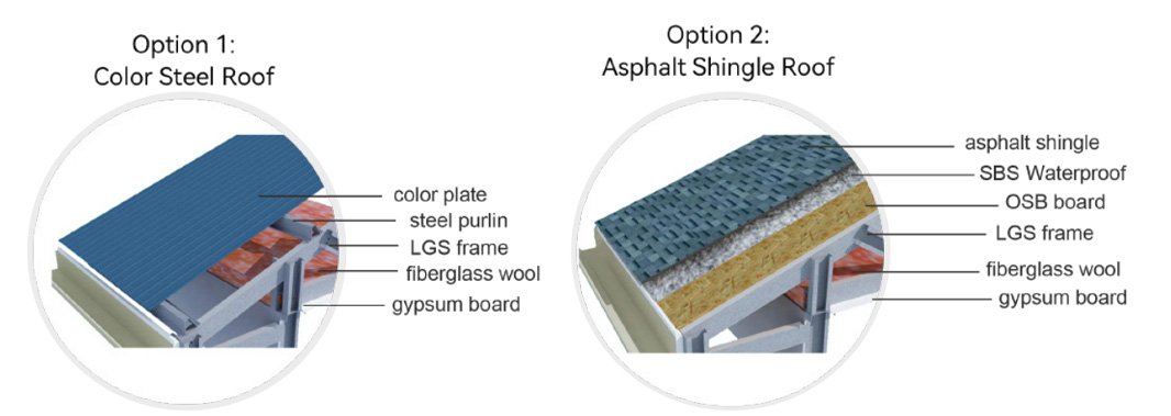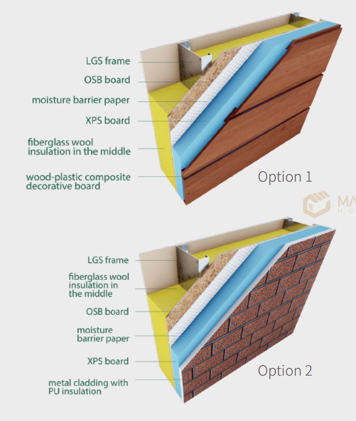 | Wall Material | ·Exterior Wall Wood Plastic Panel ·Wood Plastic Panel Trim ·XPS Board / 1200×600×100mm / Including Extruded Board Keel ·OSB Board / 1220×2440×9mm ·S550GD + AZ150 C140×1.2 Keel |